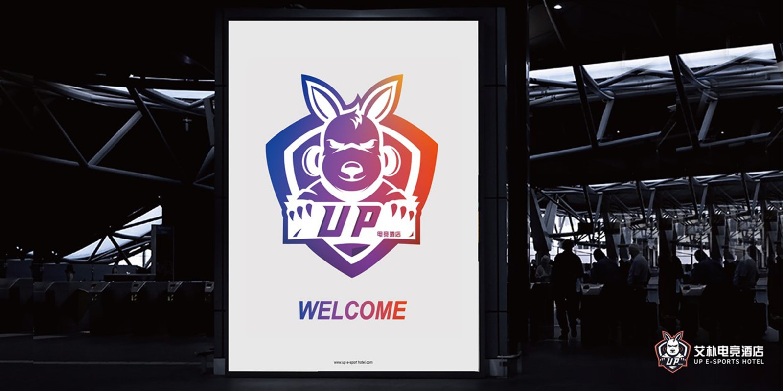 考慮到電競酒店的屬性,在標(biāo)識設(shè)計(jì)上采用英文UP作圖文標(biāo)。袋鼠本身腿長、有睡袋、只能向前奔跑,這些特點(diǎn)使得袋鼠寓意豐富。UP含有向上的、繁榮的意思,結(jié)合電競團(tuán)隊(duì)合作、勇往直前、開拓進(jìn)取、不認(rèn)輸?shù)?游戲精神,以及酒店服務(wù)效率高,服務(wù)范圍廣的經(jīng)營理念,因此在眾多動(dòng)物中選用了袋鼠作為代表形象,增強(qiáng)標(biāo)識識別度的同時(shí),也寓意著企業(yè)未來蒸蒸日上。