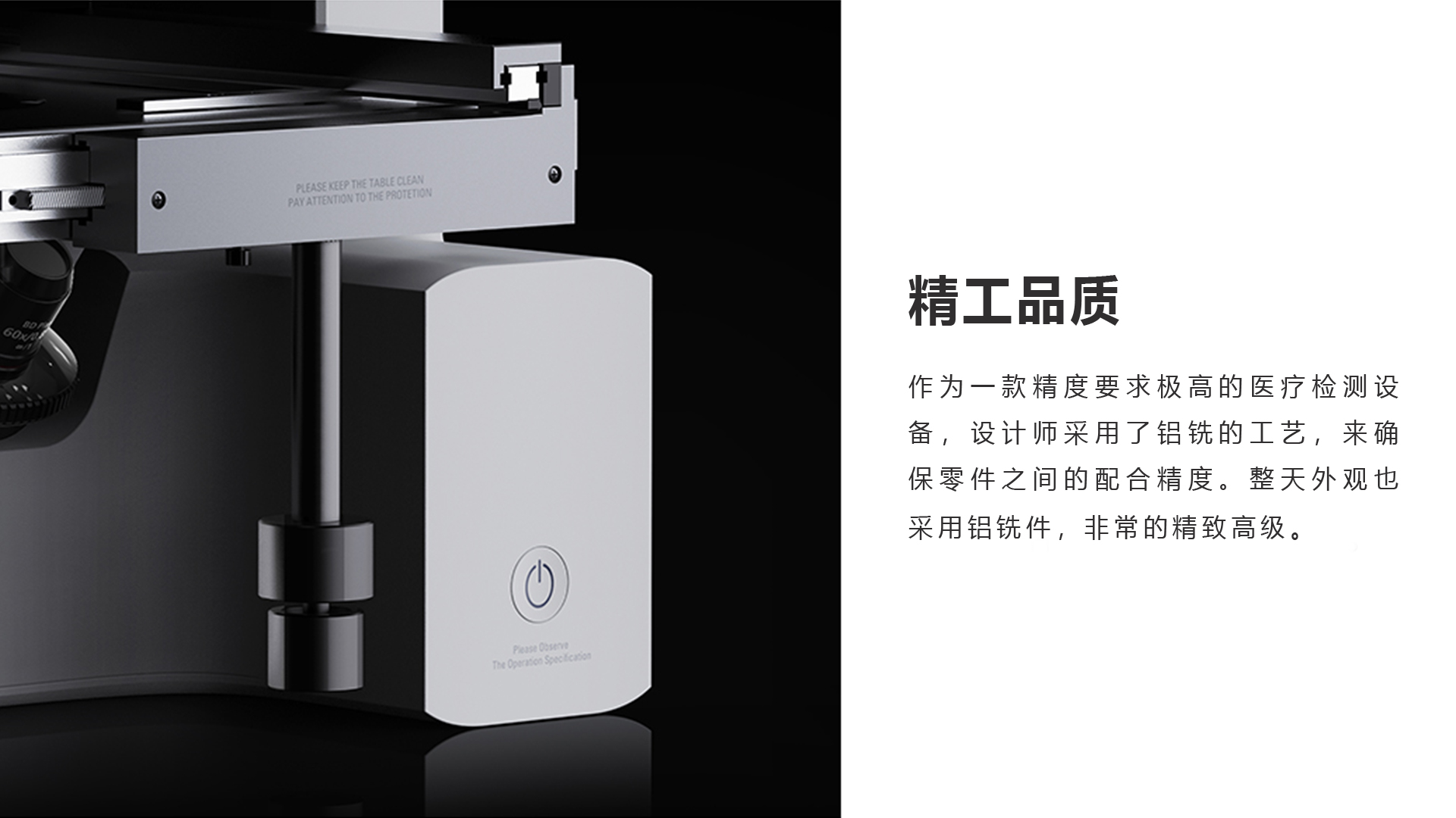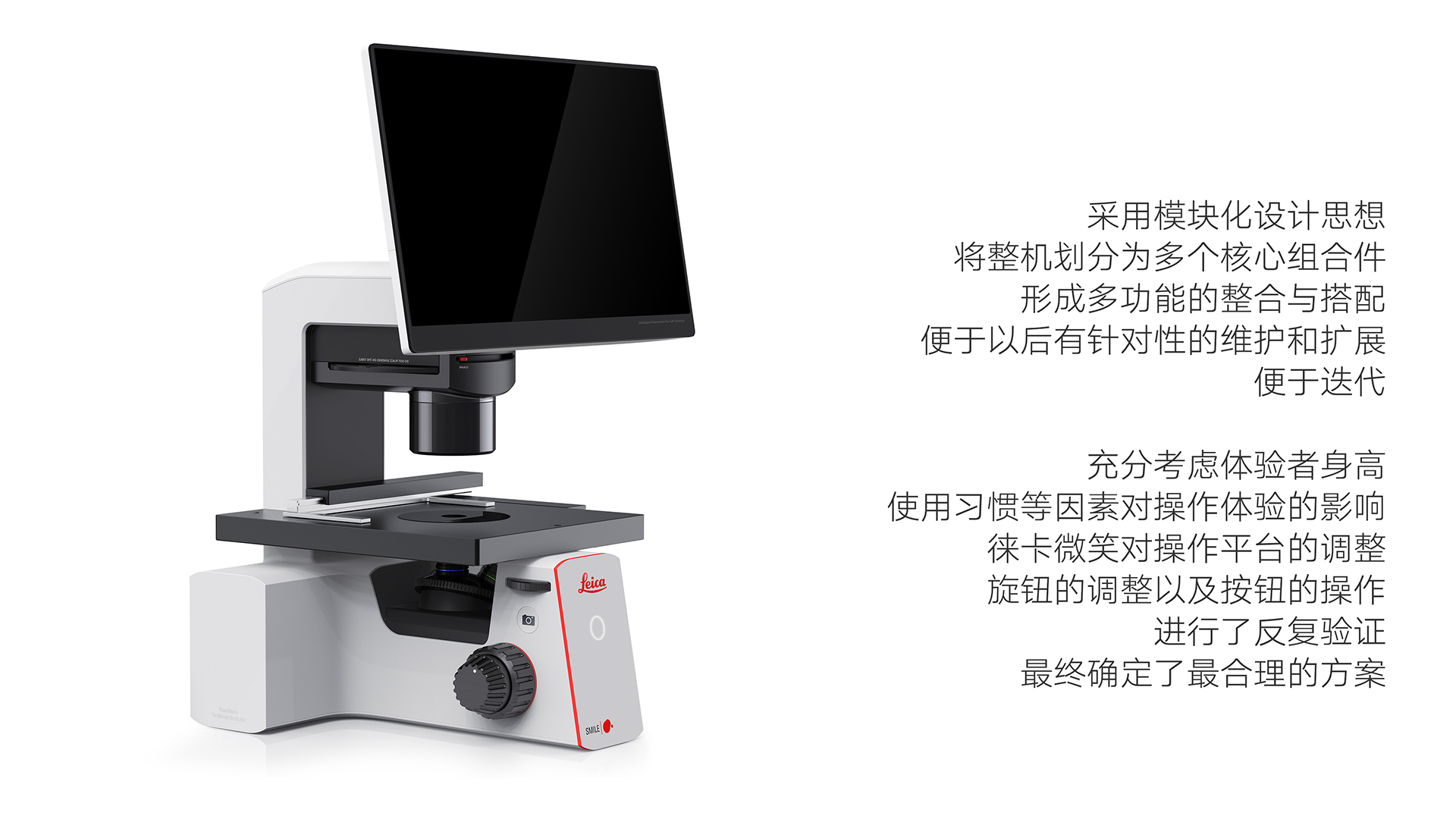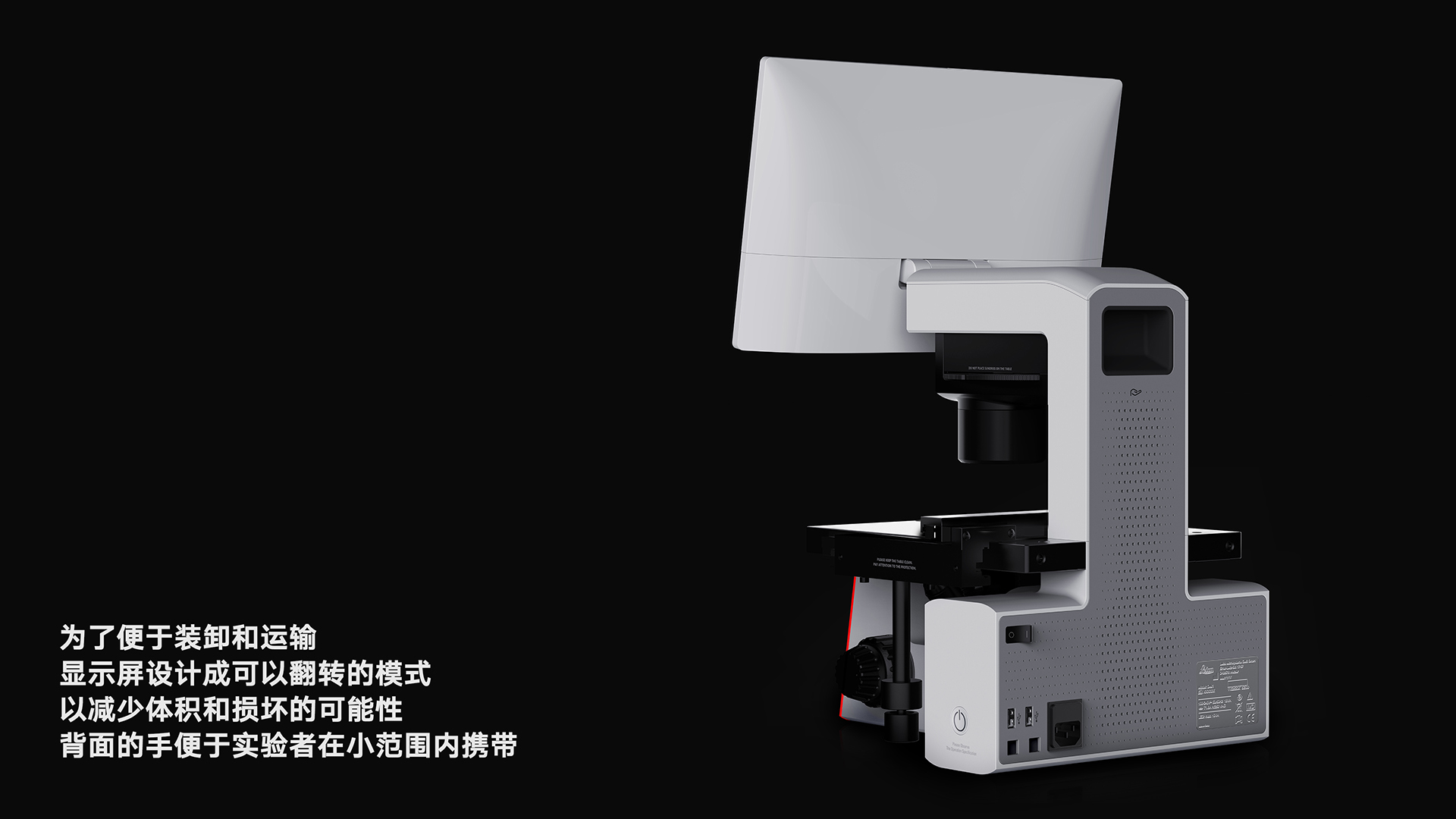 該顯微鏡采用模塊化設(shè)計思路,將整機分類成多個核心組合部件,形成多功能的整合與搭配。方便后期進行針對性維修和拓展,便于迭代。充分考慮實驗者身高,使用習(xí)慣等因素對操作體驗的影響,徠卡SMILE對操作臺的調(diào)節(jié),旋鈕的調(diào)節(jié),按鈕的操作等進行反復(fù)的驗證,最終確認(rèn)最合理的方案。產(chǎn)品為方便搬運和運輸,將顯示屏設(shè)計成可翻折的模式,減小體積,減小損傷的可能性。背后的摳手方便實驗人員在小范圍內(nèi)搬運。